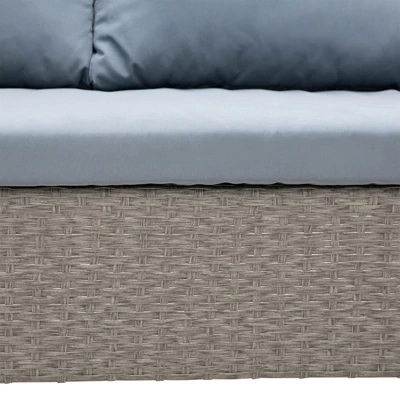 - 4 Piece Rattan Patio Furniture Set: This rattan wicker patio furniture set has two three-seat sofas, a bench, and a long tempered glass center coffee table. Accommodate guests and seat up to eight. Bring the comforts of your living room to the great outdoors and create a lovely area to lounge outside on your patio, by the pool, or gathered around the garden.