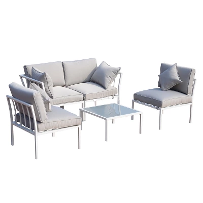 - Classic Styling: Stylish white and gray colors create an elegant look that makes this metal patio furniture set go with any setting. Clean white frames compliment the gray colored cushions and go great with the glass-topped coffee table. Together, they create a stylish and classic look in a sophisticated setting.