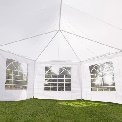 - EASILY CUSTOMIZABLE: The two solid pull-back doors and eight window walls of the party tent attach with hook and loop fasteners for quick assembly. Customize the look and feel of your gazebo canopy tent by adding or removing the walls as needed.