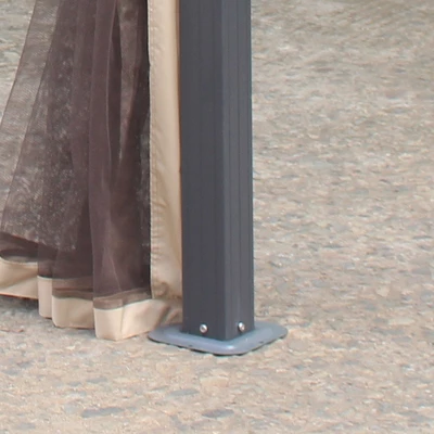 - Metal Frame Gazebo: The outdoor gazebo’s frame is made of easy-to-assemble aluminum reinforced with strong steel to help it stay sturdy. Included are eight support stakes and anchor bolts you can use to mount your gazebo to soft or hard ground.