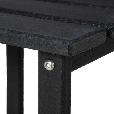- Recycled: Our outdoor side table is made of recycled HDPE, a material selected to not splinter, crack, chip, or peel. Approximately 30,000 milk jugs per hour are recycled into HDPE all-weather lumber.