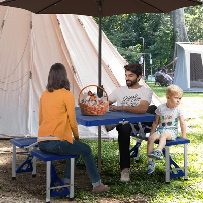 Sit and relax at the great camping table and chairs! The folding picnic table with seats is suitable for picnics, backyard BBQs, camping, and more. This sporty picnic table set features a compact fold-out table with 4 bench seats. It can be folded into an easy-to-carry suitcase to make storage quick and easy. Take this portable table and chair set anywhere, from the woods to the neighborhood park.